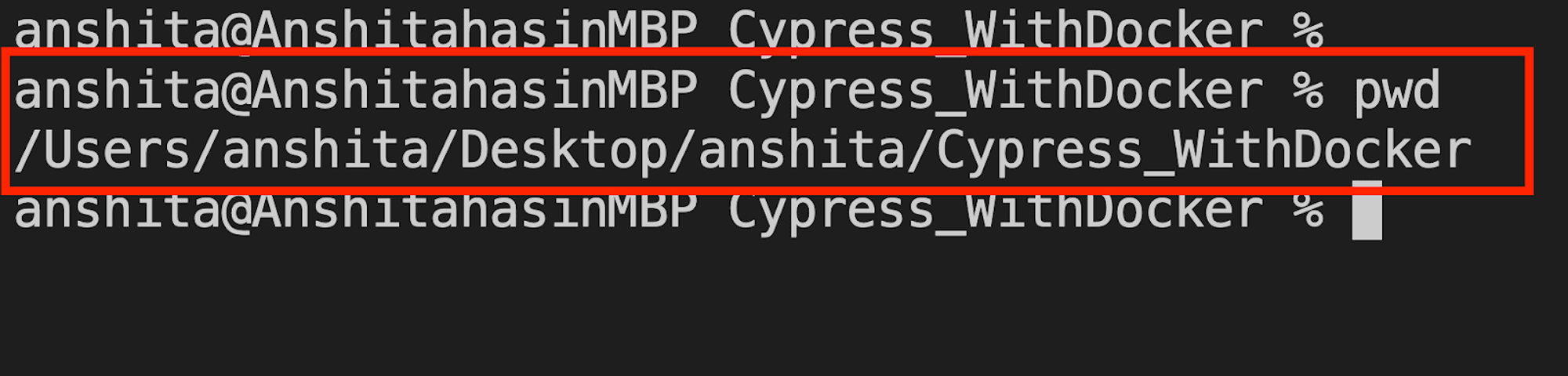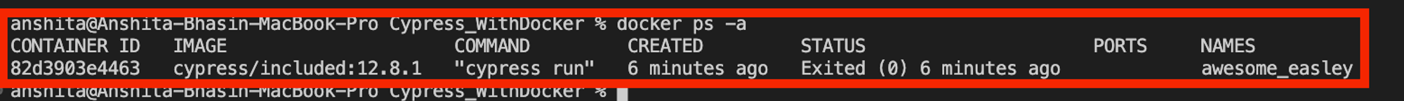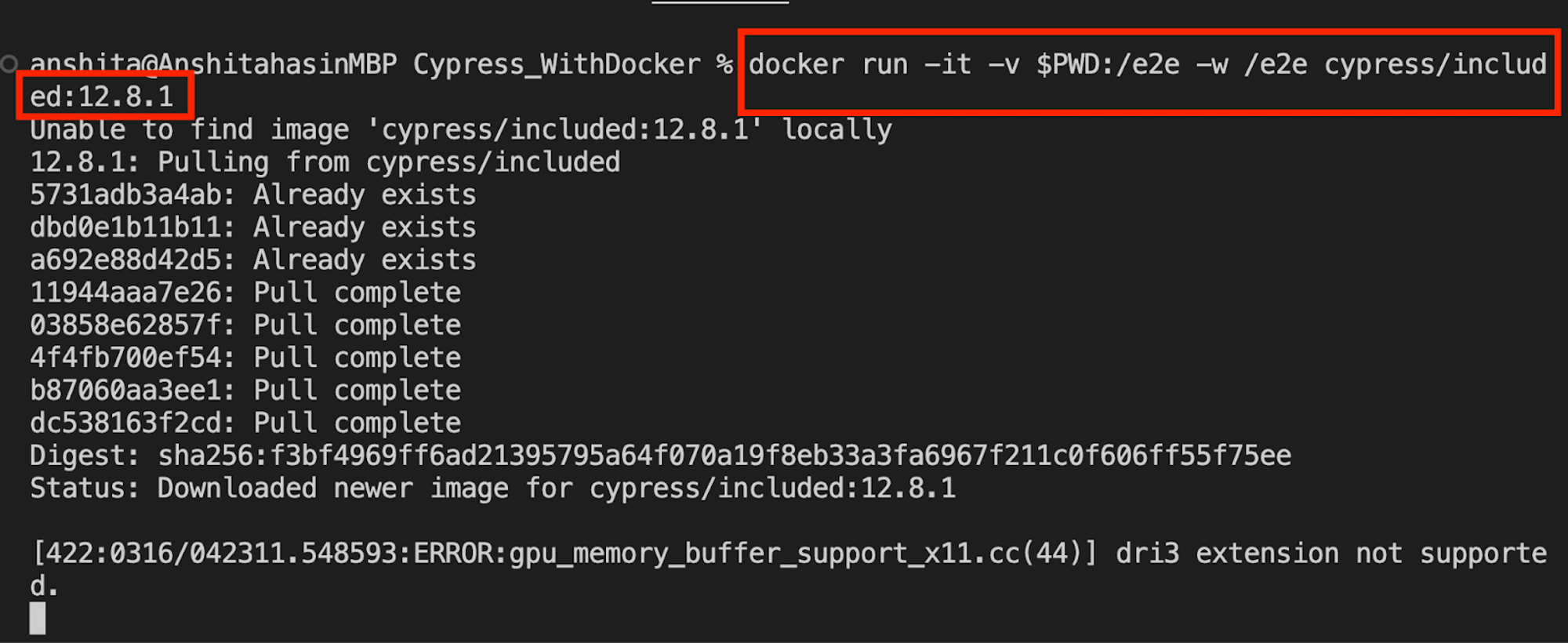 Як показано на скріншоті, система намагається знайти Cypress імедж. Спочатку він перевіряє, чи не завантажено у вашу систему. Якщо його не знайдено, система спробує завантажити образ із Docker Hub.