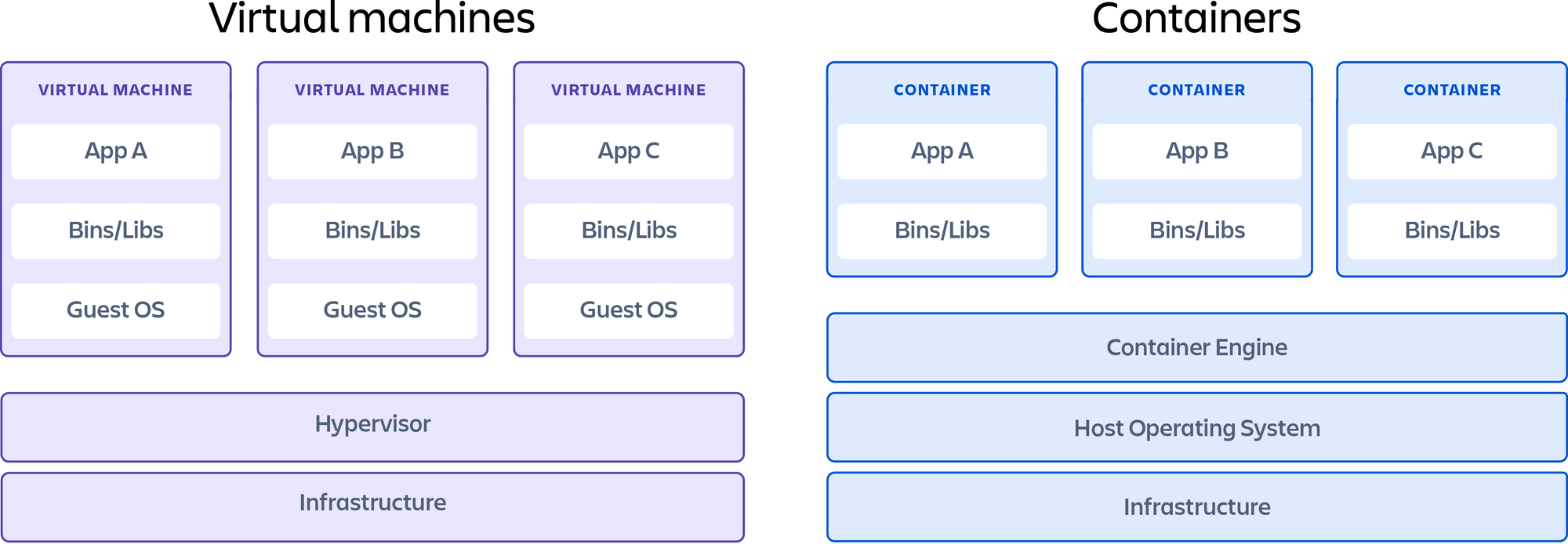 Контейнери та віртуальні машини дуже схожі технології віртуалізації ресурсів. Віртуалізація — це процес, у якому окремий системний ресурс, як-от оперативна пам’ять, процесор, диск або мережа, може бути «віртуалізований» і представлений у вигляді кількох ресурсів. Ключова відмінність між контейнерами та віртуальними машинами полягає в тому, що віртуальні машини віртуалізують всю машину аж до апаратних рівнів, а контейнери віртуалізують лише програмні рівні вище рівня операційної системи.