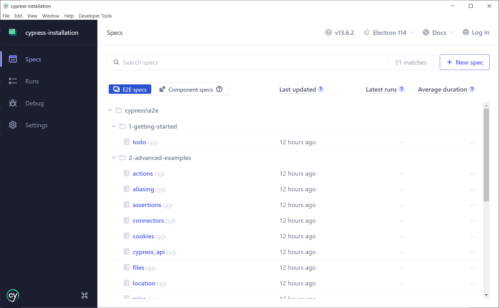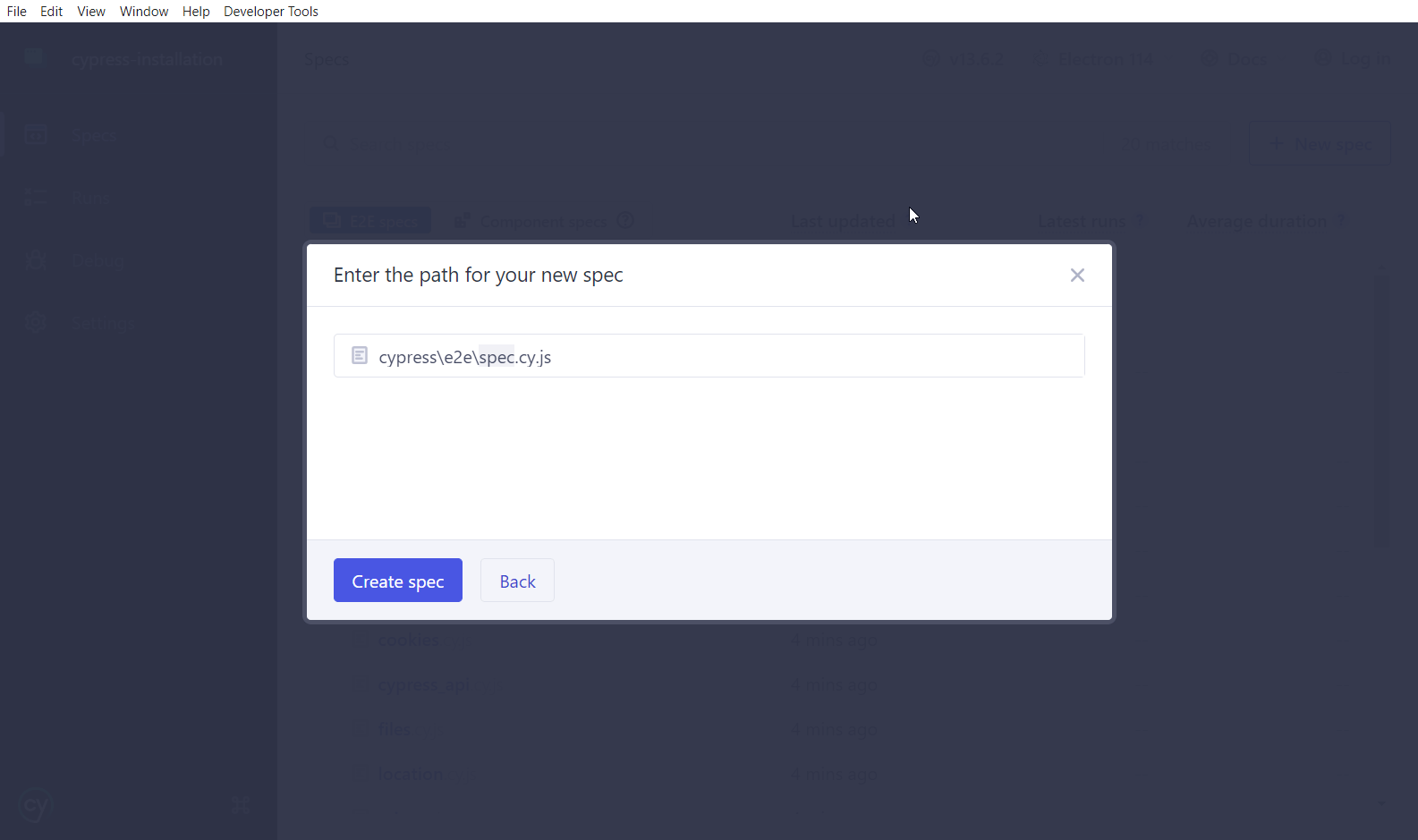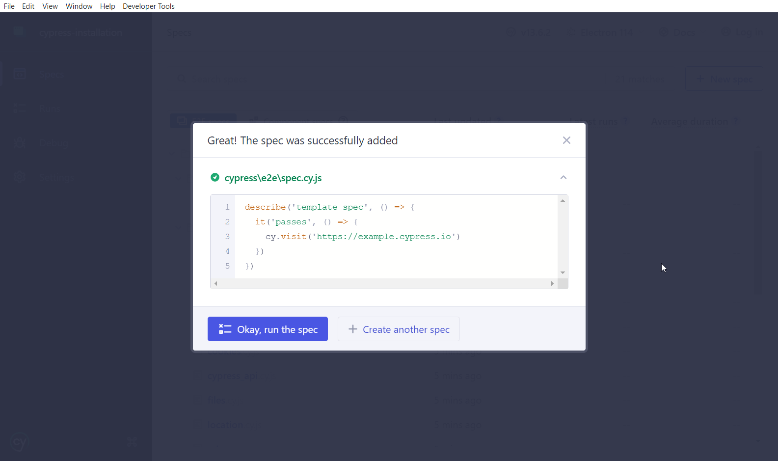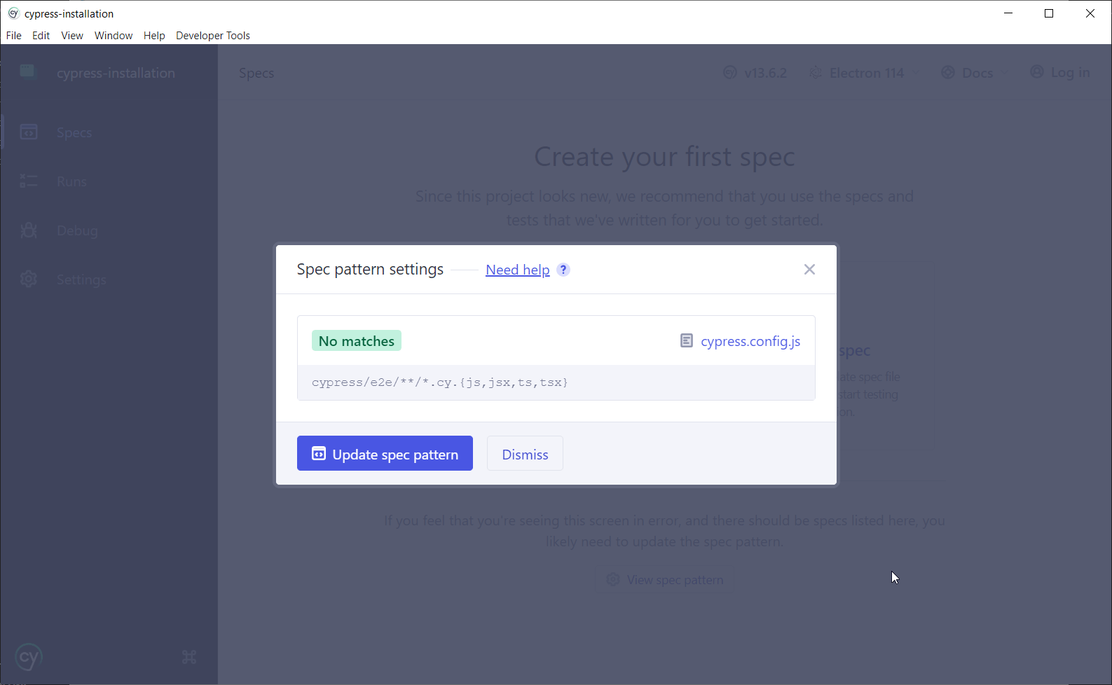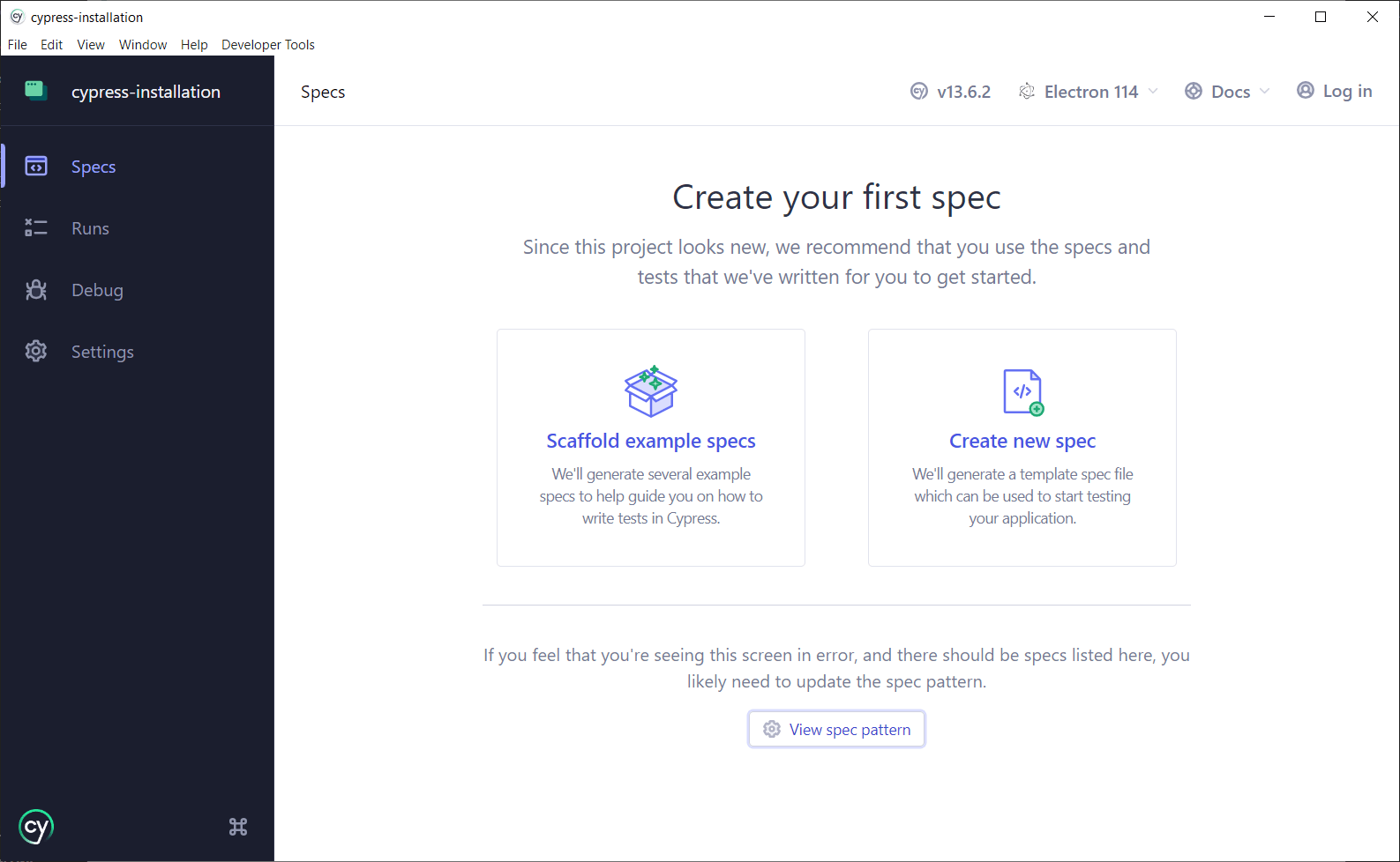 Після вибору браузера буде відкрито UI тест раннер Cypress`a, який дасть можливість створити новий spec файл Вашого тесту, сгеренувати декілька показових файлів для демонстрації (що бажано обрати у випадку, якщо поки що немає уяви про коректну структуру тестових файлів) та передивитися налаштування spec pattern`a, що означає опис налаштування патерна пошуку тест ранером відповідно сформованих та розташованих спек файлів: