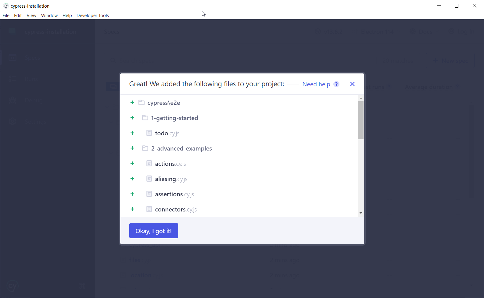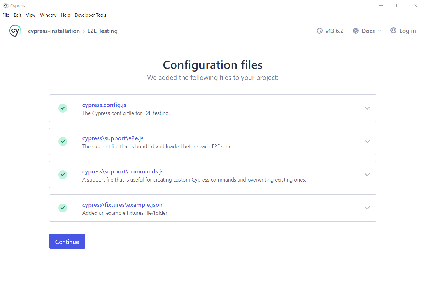 Далі після вибору E2E Testing буде запропонований огляд сгенерованих базових конфігураційних файлів проекту: