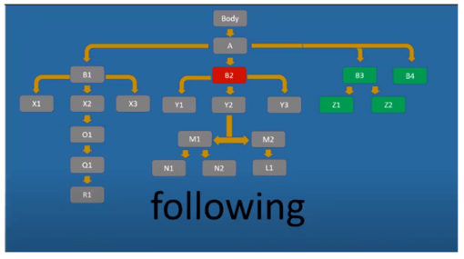 Following дозволяє вибрати всі елементи в документі, що йдуть після тега поточного вузла, що закриває. Іншими словами, нижче поточного елемента по дереву (на всіх рівнях), але виключаючи власних нащадків: